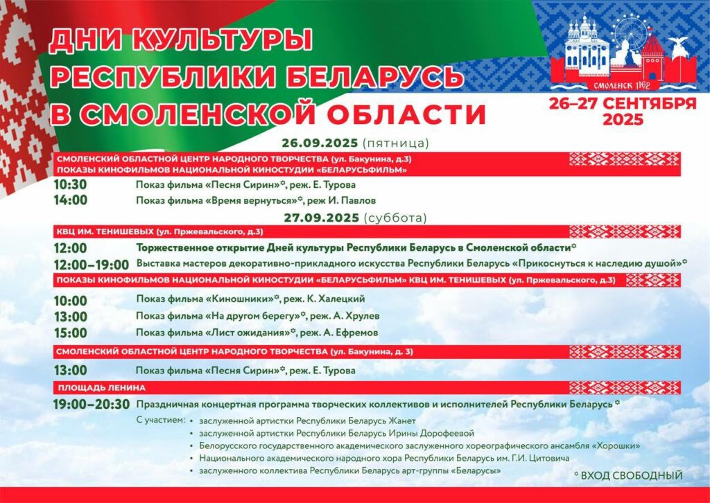 С 26 по 27 сентября в Смоленске пройдут Дни культуры Республики Беларусь. Акция напомнит о дружбе наших народов, общей истории и ценностях. Смолян и гостей города ждут кинопоказы сразу на трех площадках, а также праздничная программа с участием заслуженных белорусских артистов.