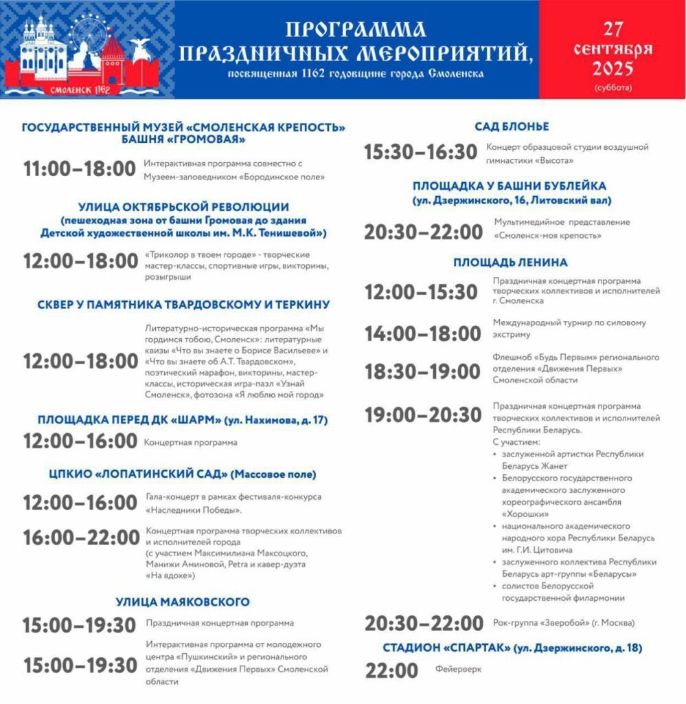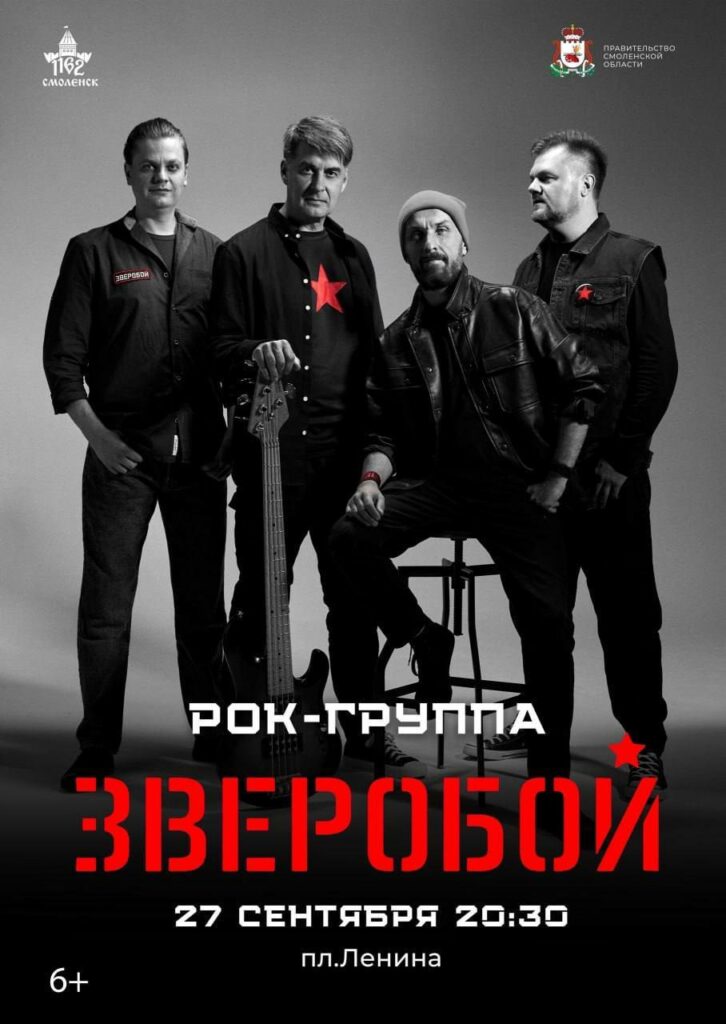 Праздничная неделя завершится концертом рок-группы «Зверобой» 27 сентября в 20:30. В 22:00 небо Смоленска озарят залпы салюта.