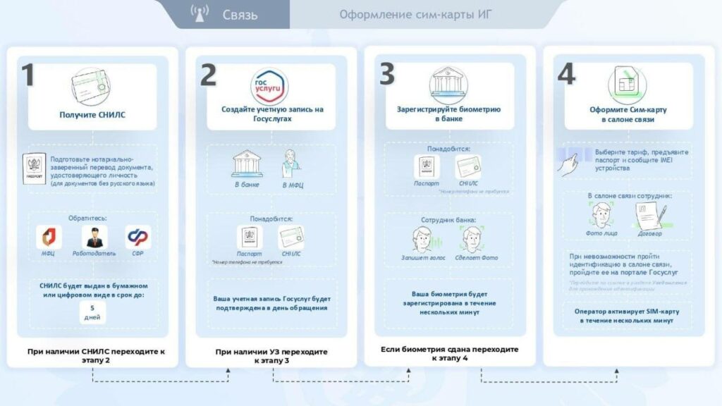 Так, по новым правилам иностранцы должны лично прийти в салон связи для оформления договора, иметь СНИЛС, подтверждённую учётную запись на «Госуслугах», а также зарегистрировать свои биометрические данные.