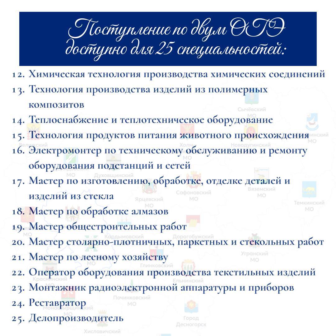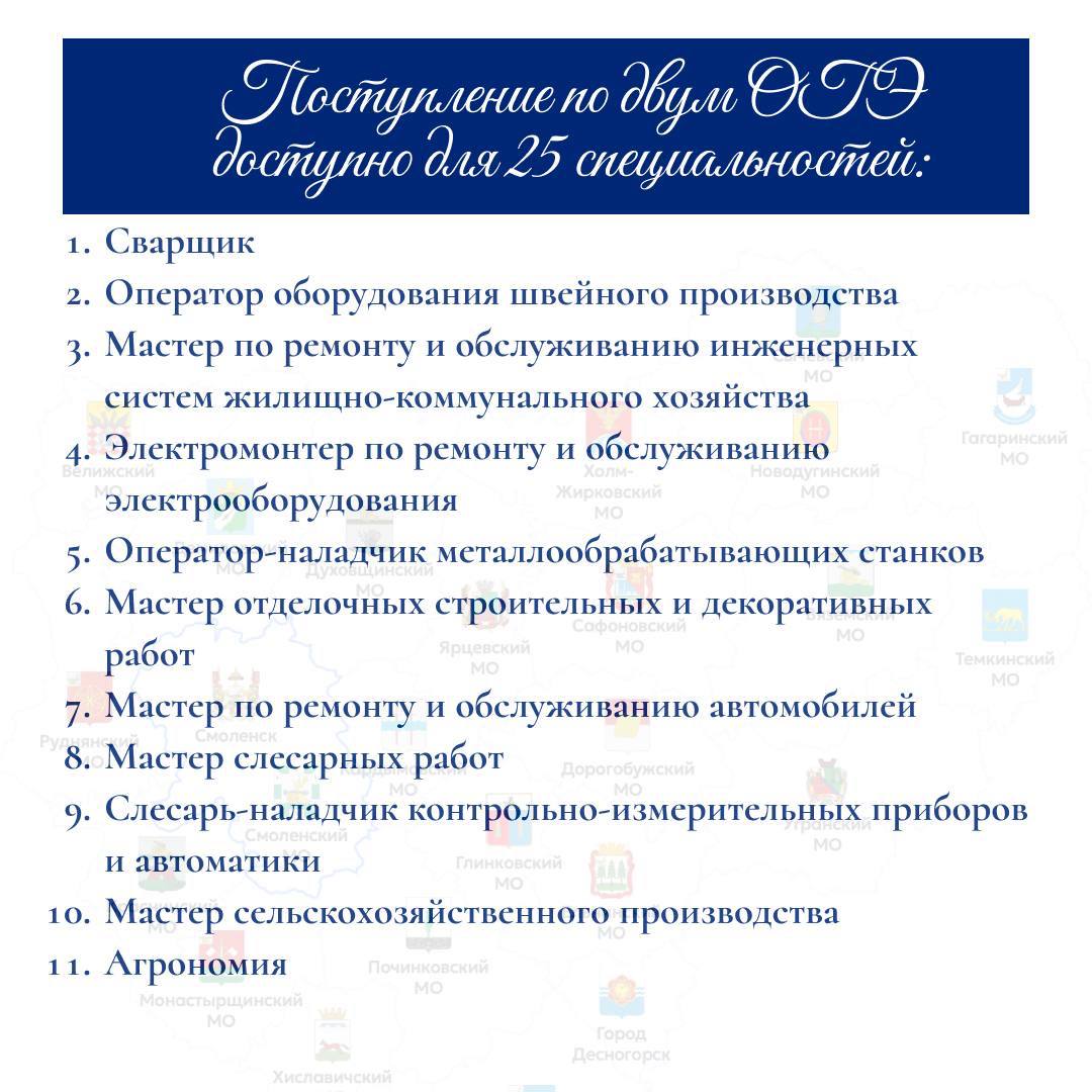 Эксперимент стартовал в прошлом году в трех субъектах – в Москве, Санкт-Петербурге и Липецкой области – и был признан эффективным. С этого года эта практика будет применяться еще в 9 регионах, в числе которых и Смоленская область. Для поступления в колледжи и техникумы выпускникам 9 классов будет достаточно сдать только два обязательных экзамена – русский язык и математику. После этого школьник гарантированно зачисляется на бюджетное место по 25 профессиям и специальностям из регионального перечня. Полный список смотрите в карточках.